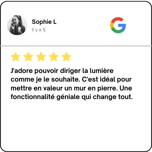 Septembre 2025Sasha D.Acheteur vérifiéUn éclairage sur mesureJ'adore pouvoir diriger la lumière comme je le souhaite. C'est idéal pour mettre en valeur un mur en pierre. Une fonctionnalité géniale qui change tout.