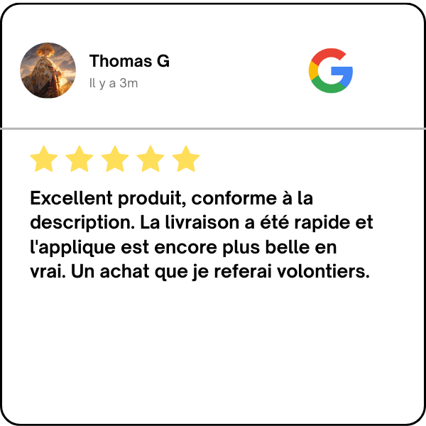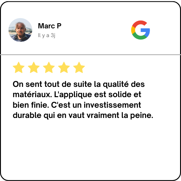 Septembre 2025Nicolas G.Acheteur vérifiéJe recommande sans hésiterExcellent produit, conforme à la description. La livraison a été rapide et l'applique est encore plus belle en vrai. Un achat que je referai volontiers.