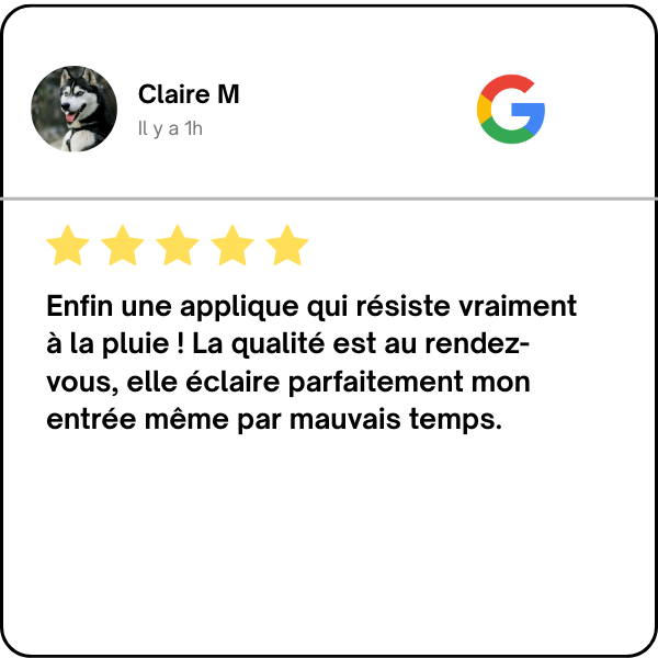 Septembre 2025Marc R.Acheteur vérifiéParfaite pour l'extérieurEnfin une applique qui résiste vraiment à la pluie ! La qualité est au rendez-vous, elle éclaire parfaitement mon entrée même par mauvais temps.