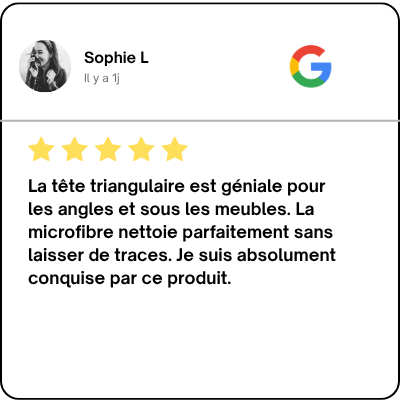 “Nettoyage rapide, atteint les coins sans effort. Le système d'essorage est génial, plus besoin de se mouiller les mains. Je recommande vivement !” ★★★★★ — Sophie D.