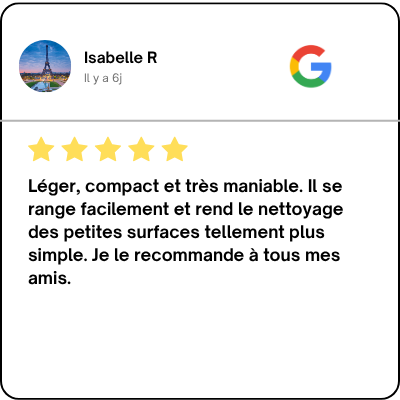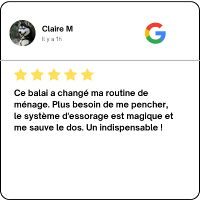 “Fini le mal de dos en me penchant pour essorer. Ce balai a changé ma façon de faire le ménage, c'est beaucoup moins fatigant.” ★★★★★ — Nathalie R.