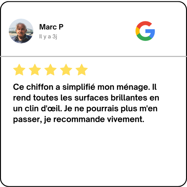 Septembre 2025Sasha D.Acheteur vérifiéUn indispensable à avoirCe chiffon a simplifié mon ménage. Il rend toutes les surfaces brillantes en un clin d'œil. Je ne pourrais plus m'en passer, je recommande vivement.
