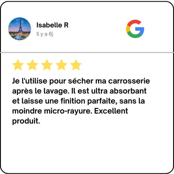 Septembre 2025Karim Z.Acheteur vérifiéIdéal pour la voitureJe l'utilise pour sécher ma carrosserie après le lavage. Il est ultra absorbant et laisse une finition parfaite, sans la moindre micro-rayure. Excellent produit.