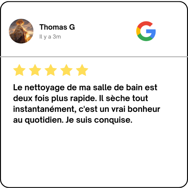 Septembre 2025Chloé G.Acheteur vérifiéVraiment magiqueLe nettoyage de ma salle de bain est deux fois plus rapide. Il sèche tout instantanément, c'est un vrai bonheur au quotidien. Je suis conquise.