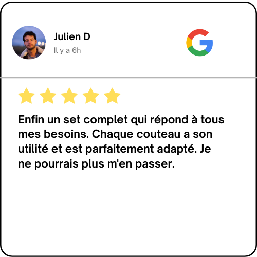 Septembre 2025Claire M.Acheteur vérifiéMon meilleur allié en cuisineSuperbe set ! J'ai toujours le couteau parfait sous la main. La prise en main est excellente et la coupe nette. Je pense en offrir un à mon fils pour Noël.